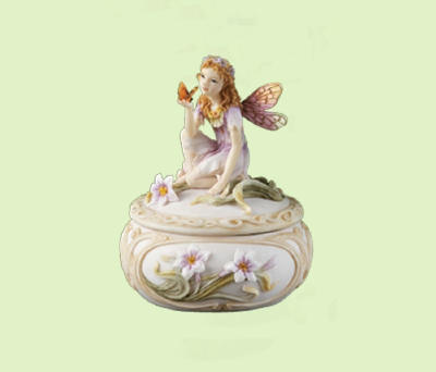 Figurine Jeweled Box > Fairy Pondering Jewelry Box In the enchanted world of Fairyland, our fairies are collector's favorites. Each charming figure is handcrafted with careful attention to detail, from the delicately carved wings to each figure's floral adornment. Hand pa