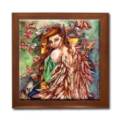 Ceramic Tile Box > Angelic Autumn Ceramic Tile Box by Artist Abranda Scisson Dark wood jewely box measures 5 1/8" x 5 1/8" x 2 3/4" and is fully lined on the inside