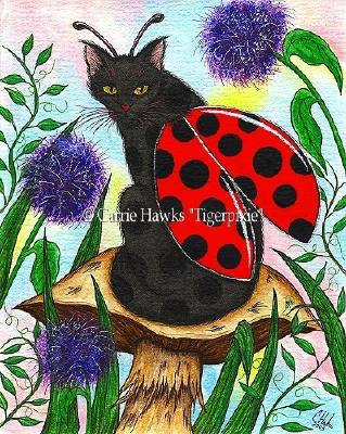 Ceramic Art Tile > Logan Ladybug Fairy Cat by Carrie Hawks 8"x10" Ceramic Art Tile with recessed hangers for tabletop or wall hanging purposes