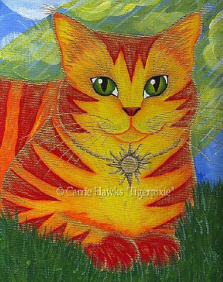 Ceramic Art Tile > Rajah Golden Sun Cat by Carrie Hawks 8"x10" Ceramic Art Tile with recessed hangers for tabletop or wall hanging purposes