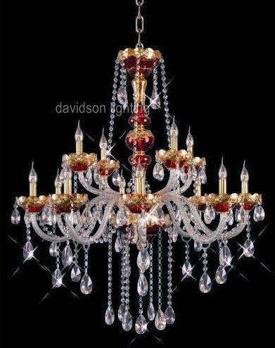 Chandelier 30% Lead Crystal Alexandria Collection # DVR78103338 Size W33" x H38" Frame color: 24k gold frame with Red finish. Contains 4+8 candeliabra bulbs - included / Availability: in stock 2-3 days
