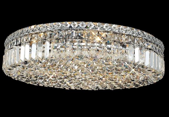 We offer high quality crystal chandeliers & lighting fixtures at low and affordable prices. We bring the European tradition into your home. High quality lighting fixtures with handmade or machine cut crystals are our main product. We offer the following exclusive lines of Venetian Murano, Swarovski crystals, Versailles, bohemian, custom made, and decorative lighting fixtures. Factory direct prices. D:24" H:5.5" Lights:9. Finish: Polished Chrome. As Shown: 30% Lead Crystal. Available: Swarovski Spectra & Swarovski Strass. Available in 24k gold and chrome frame.
