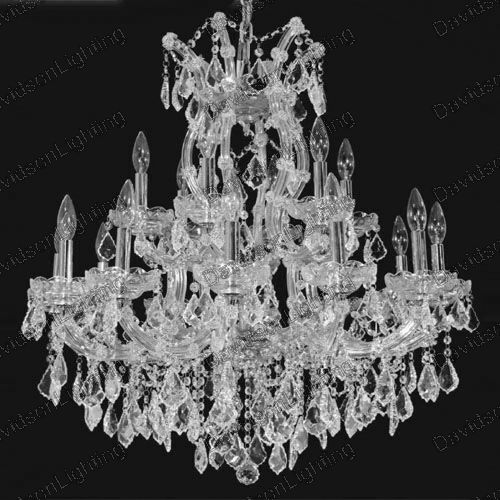 Chandelier 30% lead Crystal Maria Theresa Collection # DVR280030A / Dimentions: D 30" x H 28" / Frame color: polished chrome, also available in 24k gold frame / Contains 19x60w candeliabra bulbs - included / Availability: in stock 2-3 days