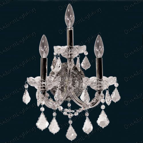Swarovski Spectra Authentic Crystal Wall Sconces # DVR28003WS / Dimentions: D 12" x H 22" / Frame color: polished chrome, also available in 24k gold frame / Contains 3x60w candeliabra bulbs - included / Availability: in stock 2-3 days
