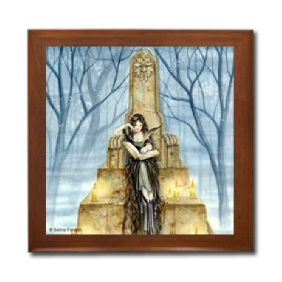 Ceramic Tile Box > Storykeeper Ceramic Tile Box by Artist Selina Fenech Dark wood jewely box measures 5 1/8" x 5 1/8" x 2 3/4" and is fully lined on the inside