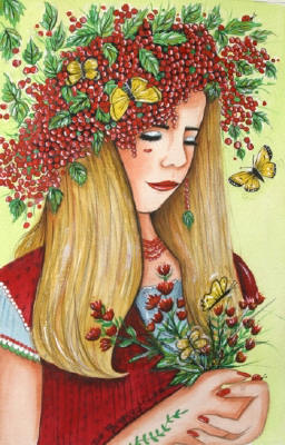 Ceramic Art Tile > The Berry Fairy by Sue Miller 8"x10" Ceramic Art Tile with recessed hangers for tabletop or wall hanging purposes