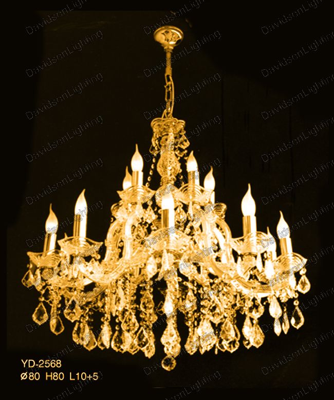 Chandelier 30% lead Crystal # YD2568L15ag / Dimentions: w20" x h26" / Frame color: polished chrome, also available in 24k gold frame / Contains 9x60w candeliabra bulbs - included / Availability: in stock 2-3 days